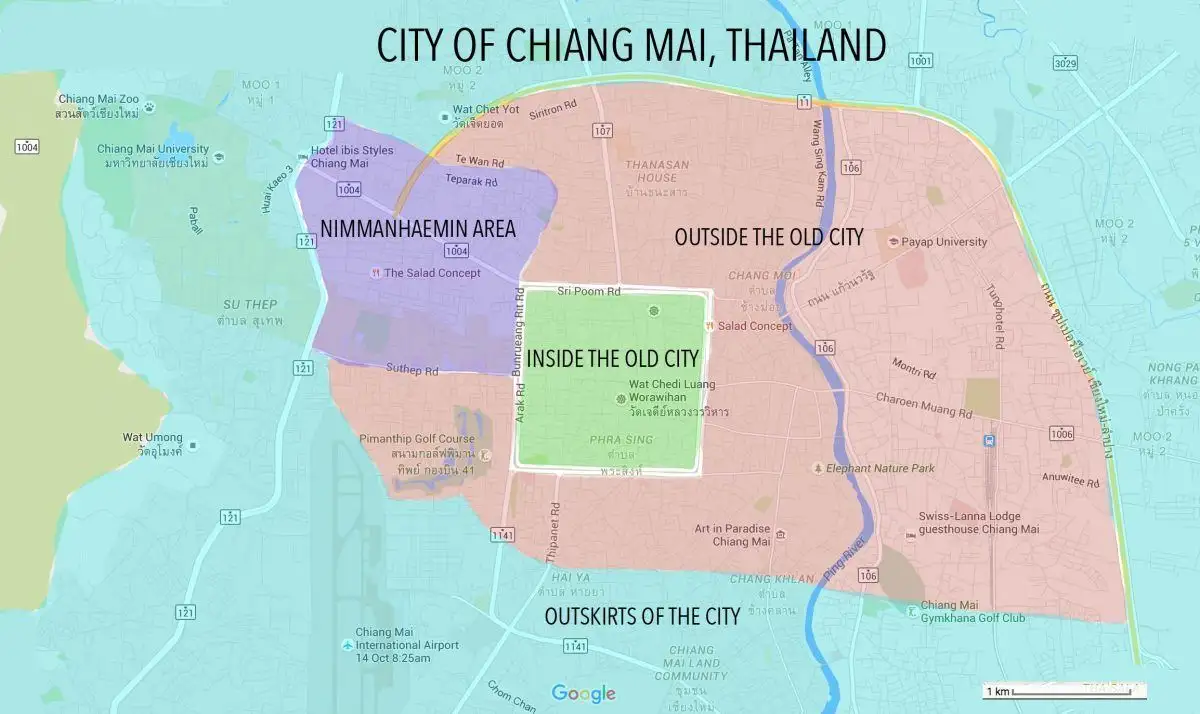 チェンマイの各エリアには独自の美学があり、訪問者に何か新しいものを提供します。チェンマイのホテル、ホステル、レンタル施設は、かなりの数のエリアに点在しています。チェンマイを初めて訪れる人の多くは、歴史的な建造物に注目する傾向があります。 オールドシティ そしてトレンドの ニマンヘイミン (多くの場合ニマンと短縮される) エリア。